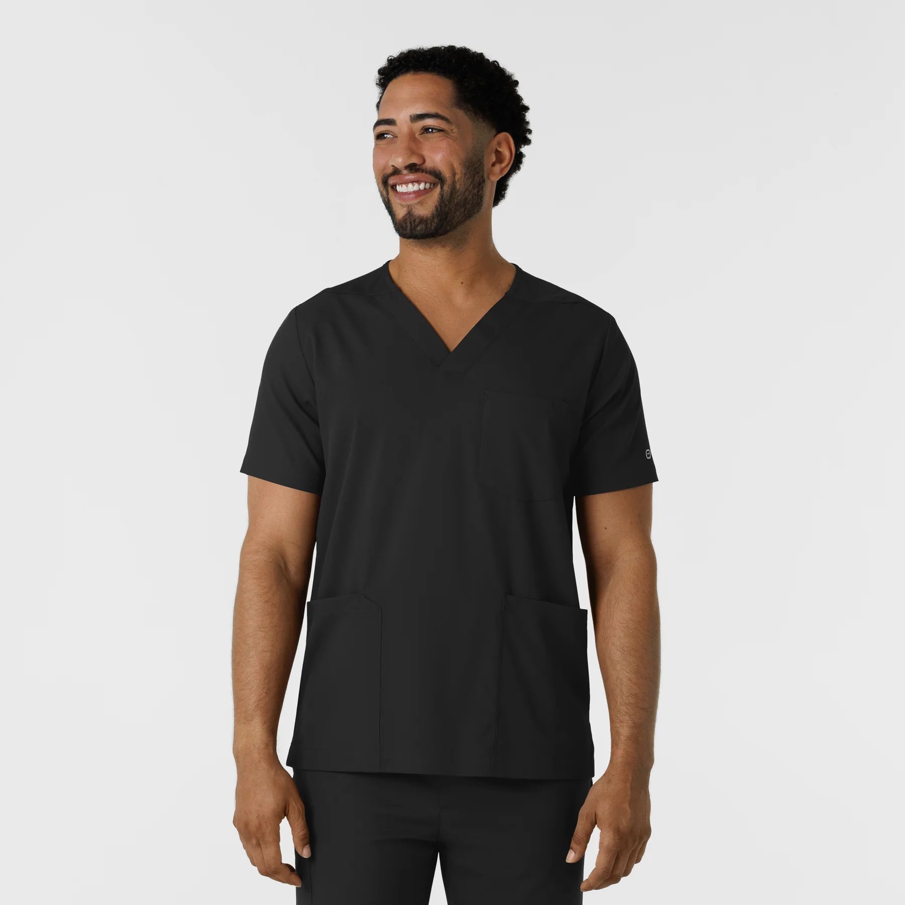 When your skills team up with functional workwear, there's no stopping how well you care for your patients. This men's scrub top gives you comfort, style and utility all in one versatile, easy-to-wear piece. It's made with a stretchy, soft material that won't restrict your movement as you make your way through busy shifts and long clinic days. You'll always have what you need nearby thanks to two top-loading pockets, one of which includes a pen slot to keep one of your most-used essentials right where you need it. One back card pocket with a zipper closure holds small items you'd prefer to keep close. Side hem vents open up the silhouette so your scrub top won't bunch up or constrict as you lean, twist and pivot from task to task. The classic V-neck design looks crisp and professional, giving you a polished look every time you suit up. The hem is slightly longer in the back for a modern fit.